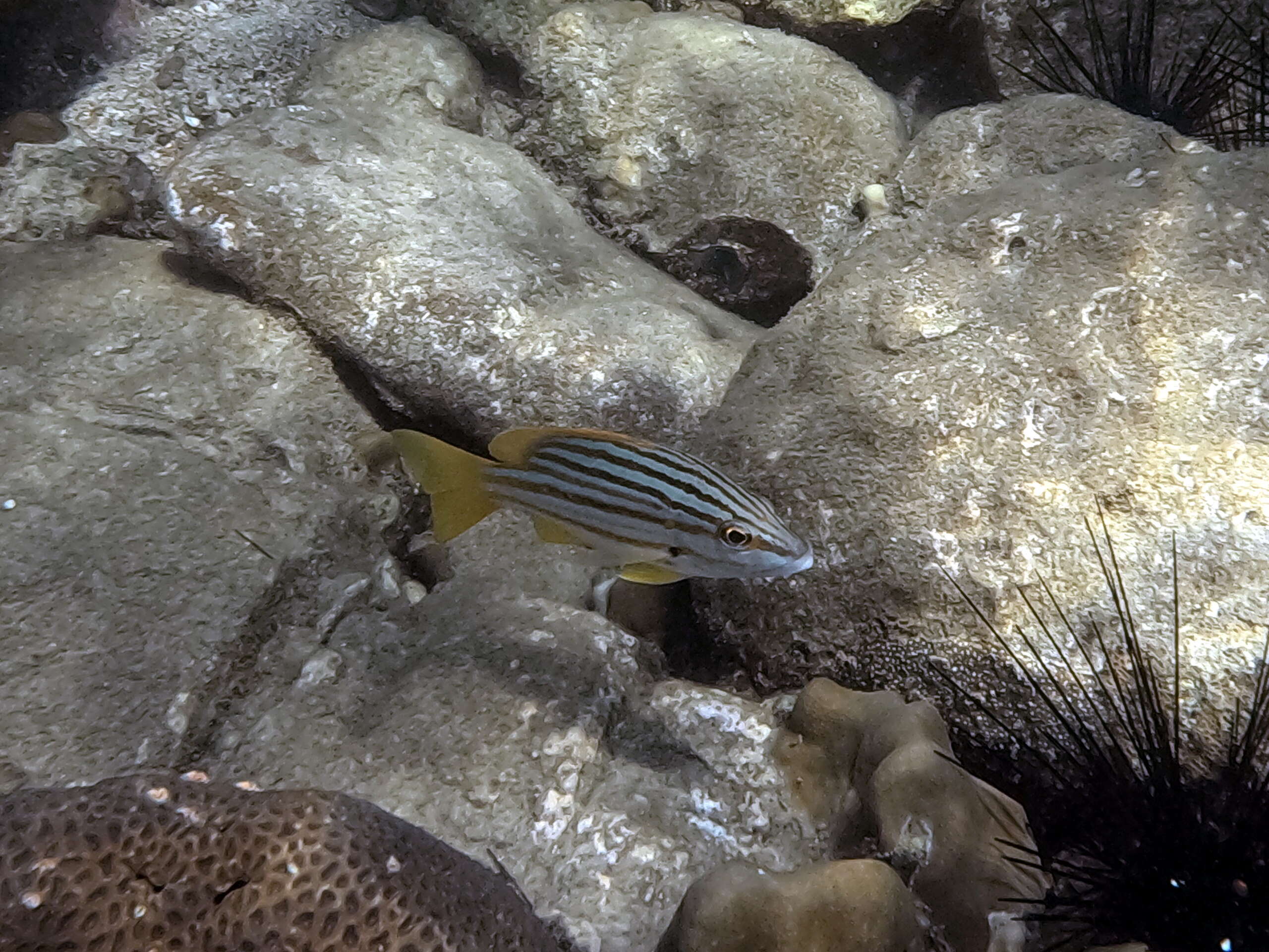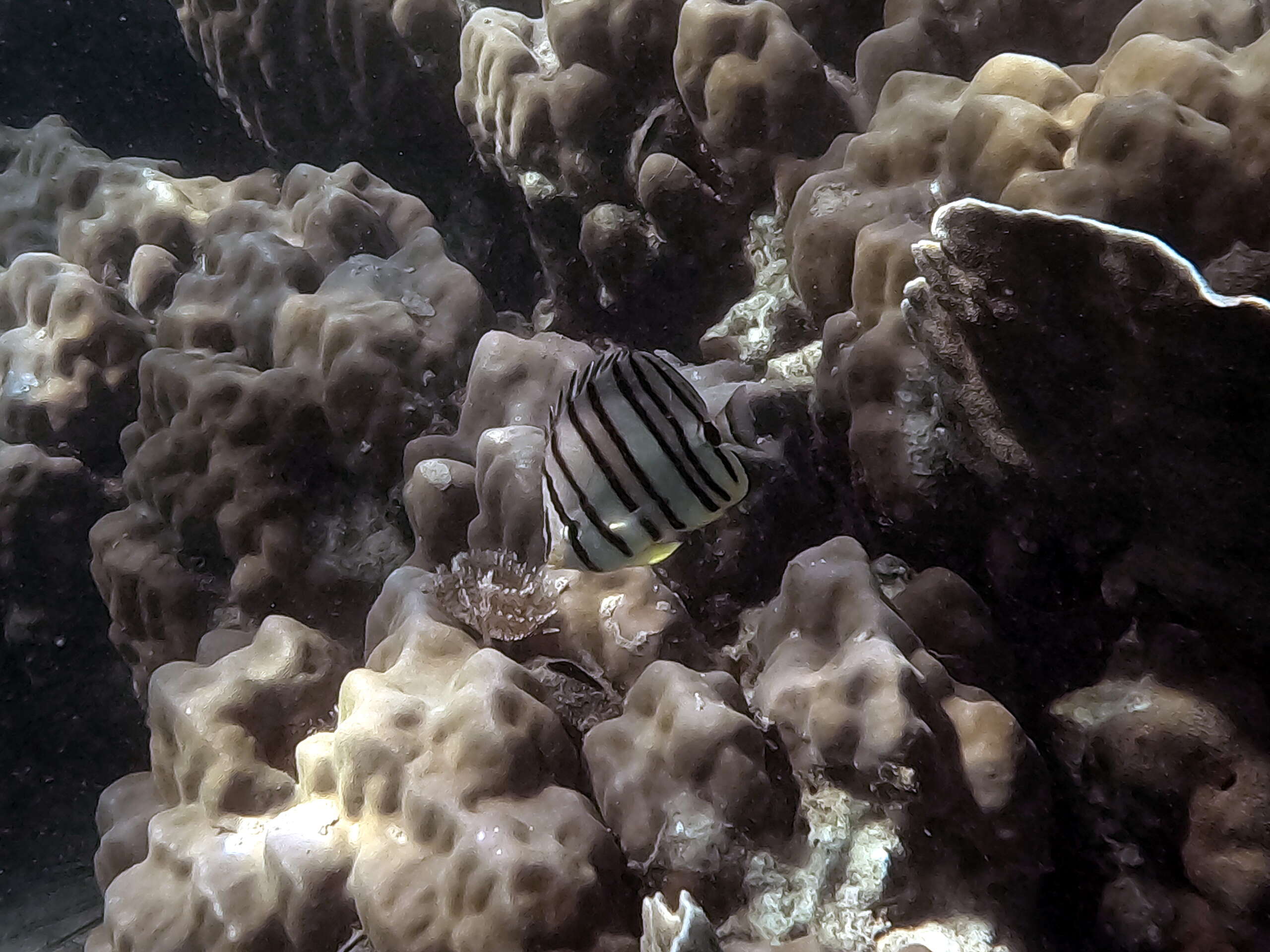 Sabelle magnifique, Sergent major, Savonnette à deux bandes, Rascasse volante, Porc-épic à taches auréolées, Platax à longues nageoires, Papillon à huit bandes, Papillon à bandes cuivrées, Oursin diadème à anneau orange, Monodactyle argenté, Lapin à selle dorée, Labre à long museau (femelle), Labre échiquier, Happeur à deux lignes, Gaterin noir, Diagramme noir, Baril de rhum, Demoiselle à trois points (adulte), Corail corne de cerf, Corail Goniopora, Corail dôme poreux, Corail cactus, Corail boomerang, Clown à selle blanche, Bénitier, Apogon à cinq lignes, Aiguille crocodile, Vivaneau drapeau, Ballon étoilé, Ange annelé.
