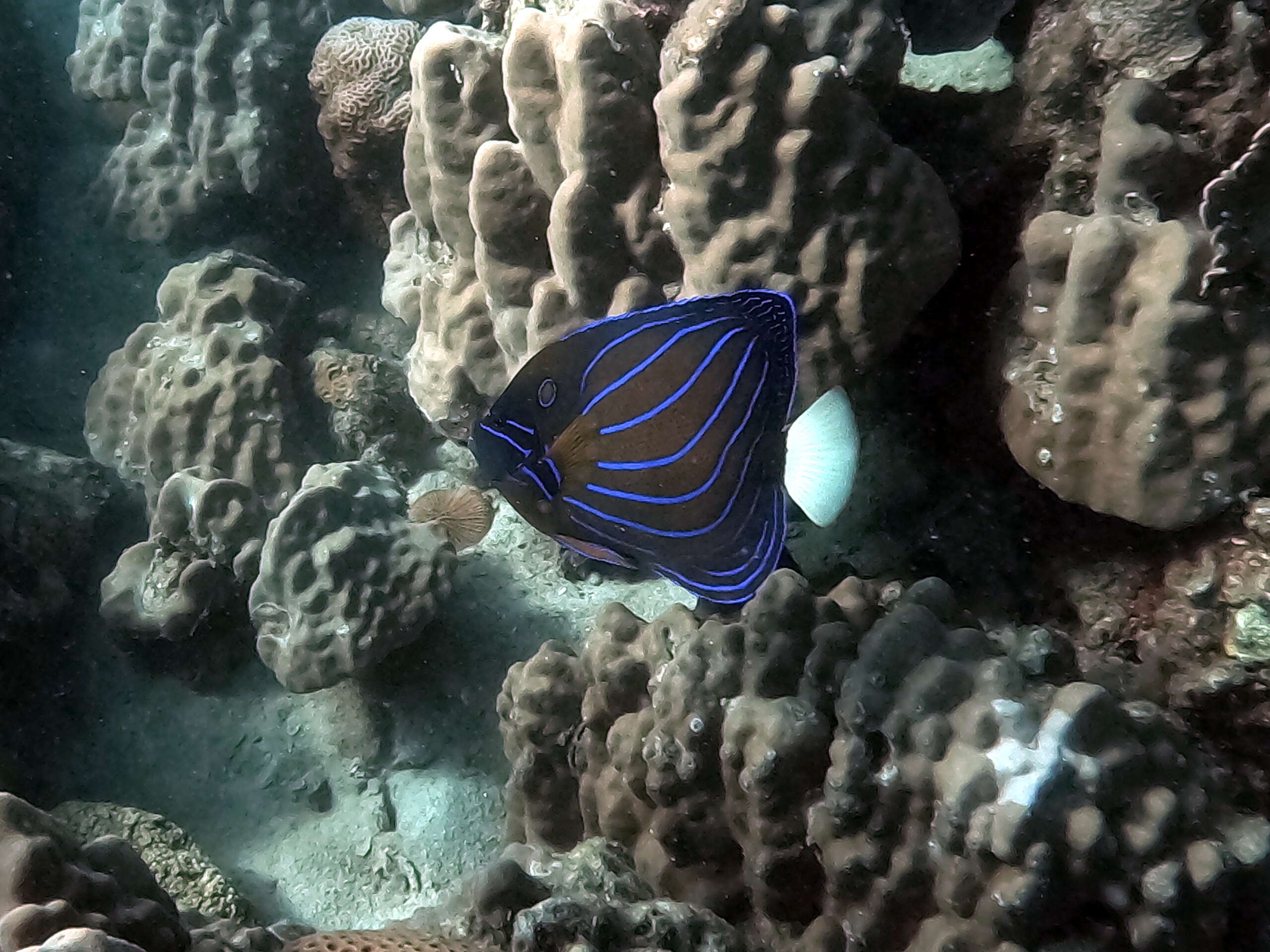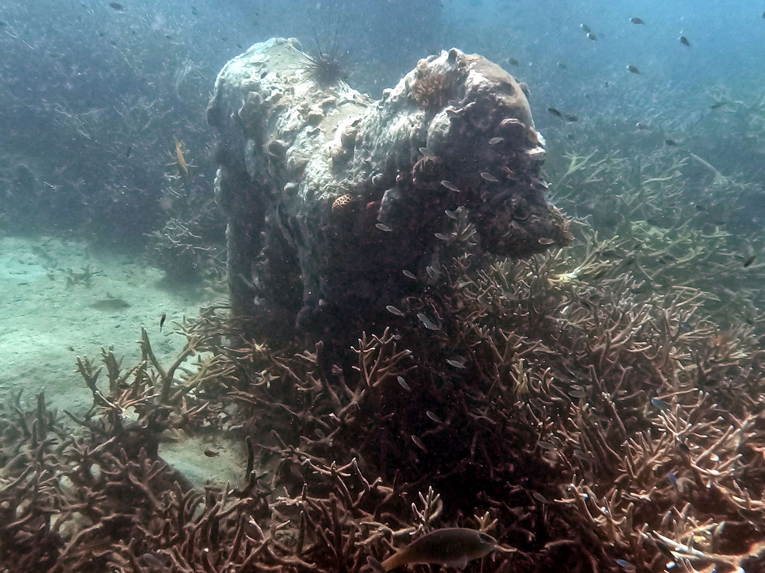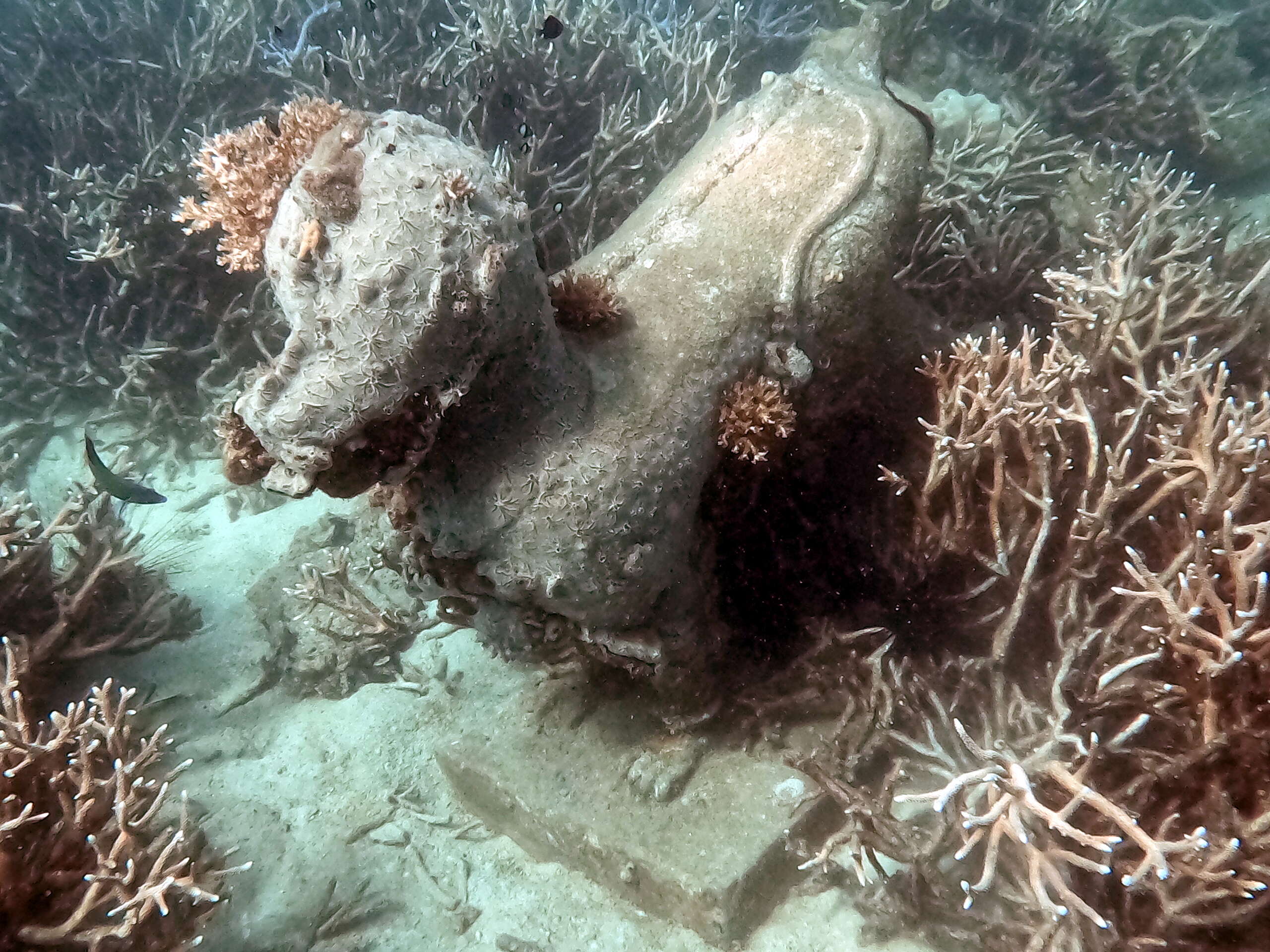 Le long de ce trajet, on peut observer de nombreux coraux et poissons, j’ai pu voir une rascasse volante dans la petite baie où il y a un ponton avec des bateaux de pêcheurs. Arrivés au spot de snorkeling, on pourra observer à approximativement 5 mètres de profondeur des statues d’éléphant, vache, chien, cheval qui sont posées au milieu de coraux multicolores. On peut croiser une multitude de poissons divers qui nagent au milieu des coraux et statues, une belle expérience à renouveler.
