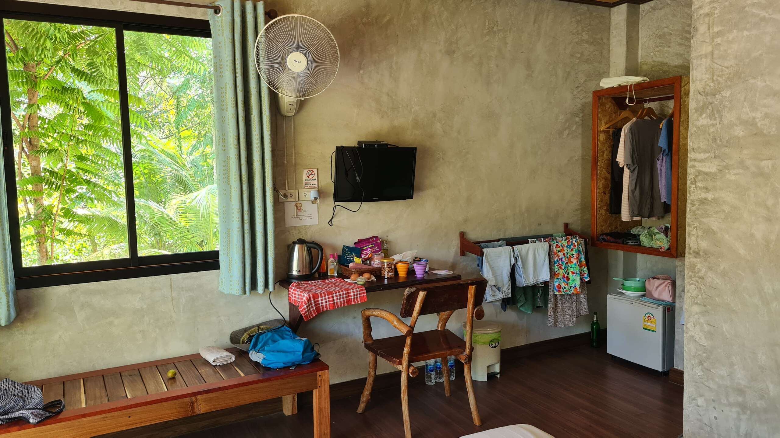 En 2020, nous avions loué un bungalow au cœur d’une cocoteraie, sur la côte ouest, secteur de « Klong Chao Beach ». Quatre bungalows ont été construits par la famille propriétaire de la cocoteraie, avec un petit magasin d’alimentation de base tenu par cette famille, ils fournissent en plus scooter et vendent le carburant en bouteille d’un litre. Cela reste cher (50 euro la nuit), soit deux fois plus cher que sur les îles de « Koh Tao », « Koh Chang » ou « Koh Pha Ngan », on pourrait s’attendre à mieux de l’hébergement « Baan Puen ».
