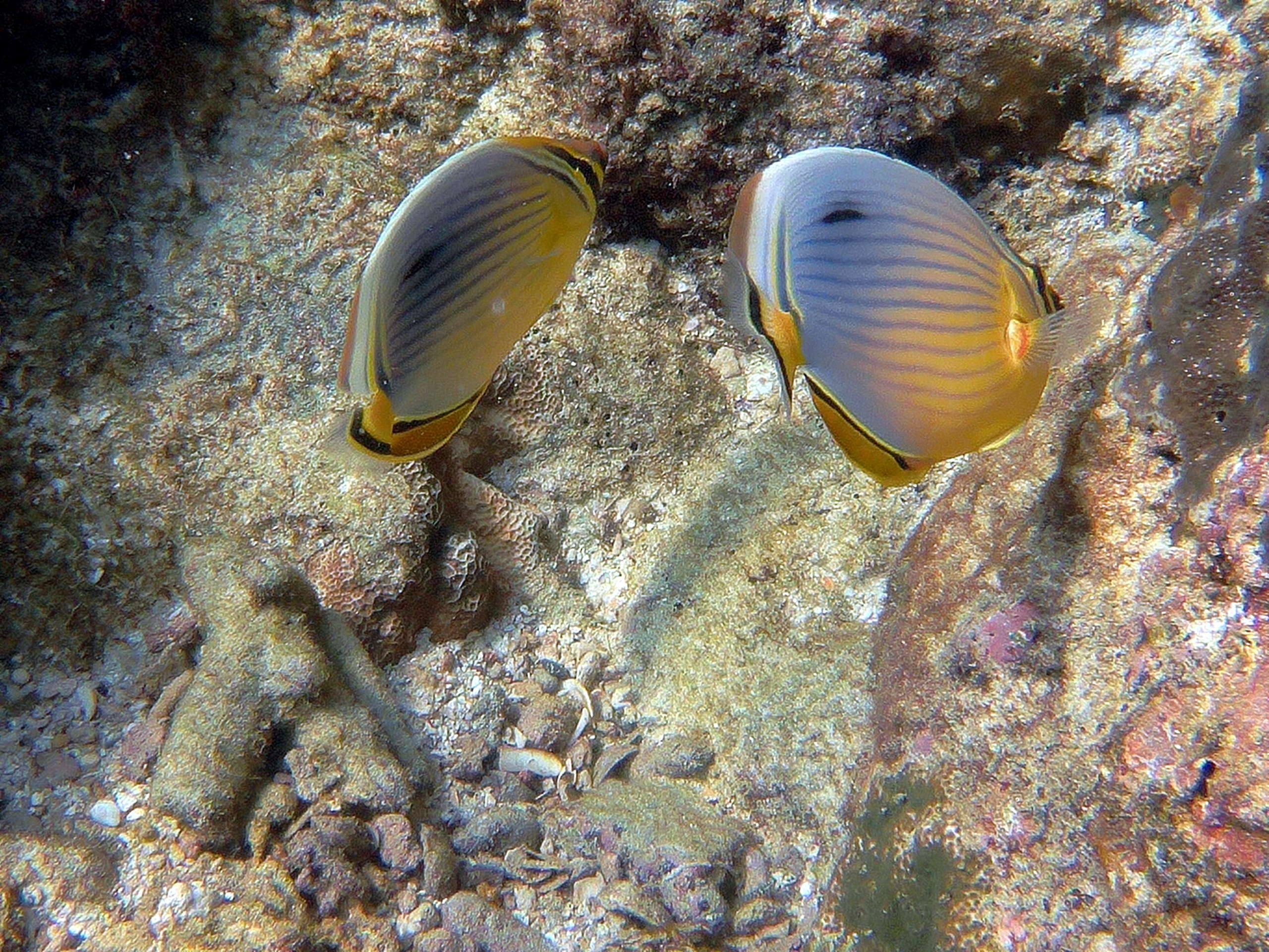 Calmar de récif, Corail Acropore, Diodon commun, Idole des maures, Nason à éperons bleus, Chirurgien à poitrine blanche, Papillon à chevrons, Papillon pakistanais, Papillon côtelé indien, Perroquet commun, Poisson Flûte, Rouget à nageoires jaune.