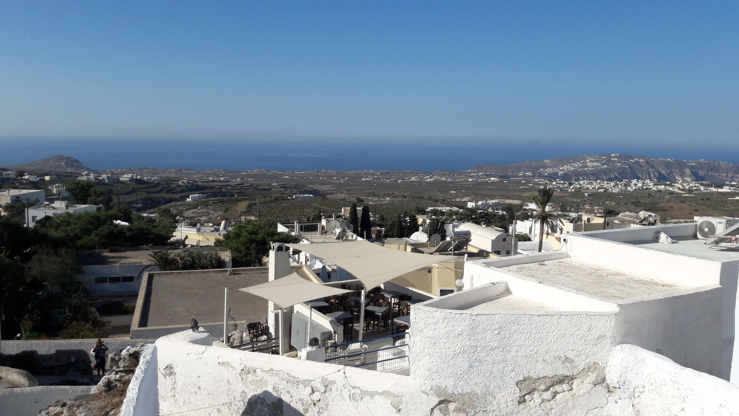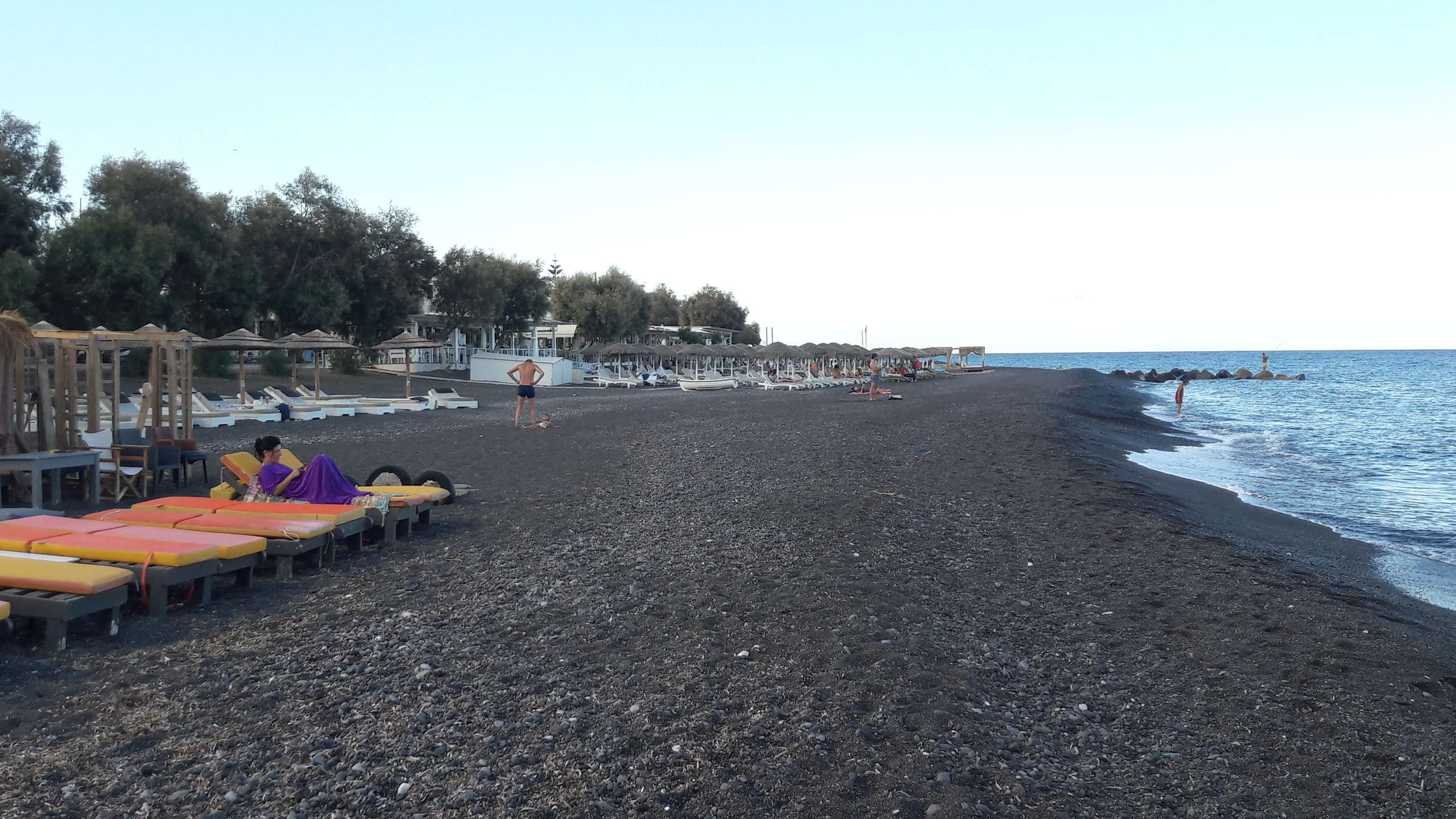 Au retour de Milos, nous passons notre dernière journée sur la plage de sable noir de Kamari, située au sud-est de Santorin, proche de l’aéroport où nous embarquerons un peu avant minuit, pour rentrer sur Marseille.