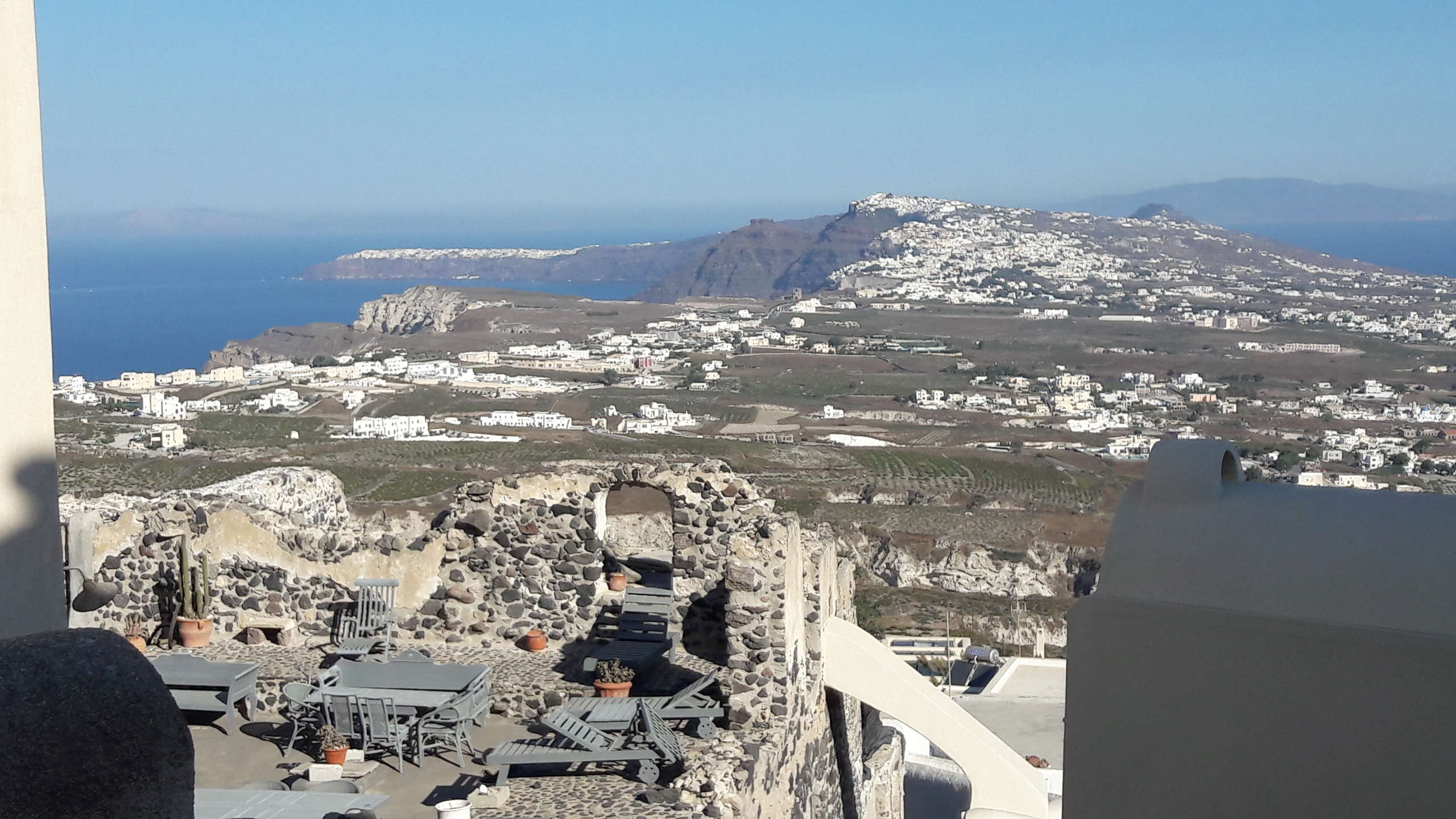 Pori mini-port avec son église sur les hauteurs, Pyrgos petit village typique grec avec ses ruelles et maisons blanches, Kamari petite station balnéaire à plage de sable noir.