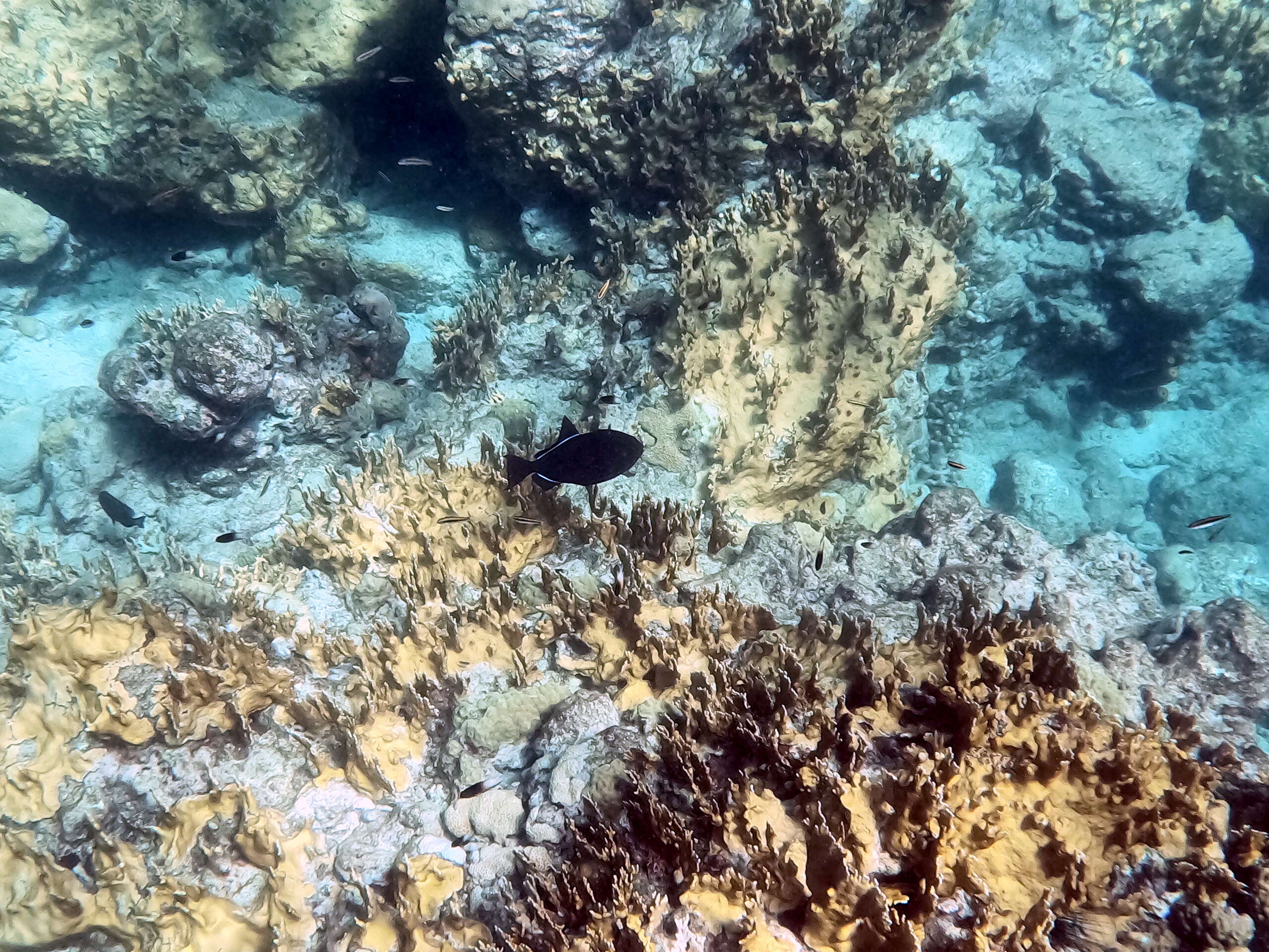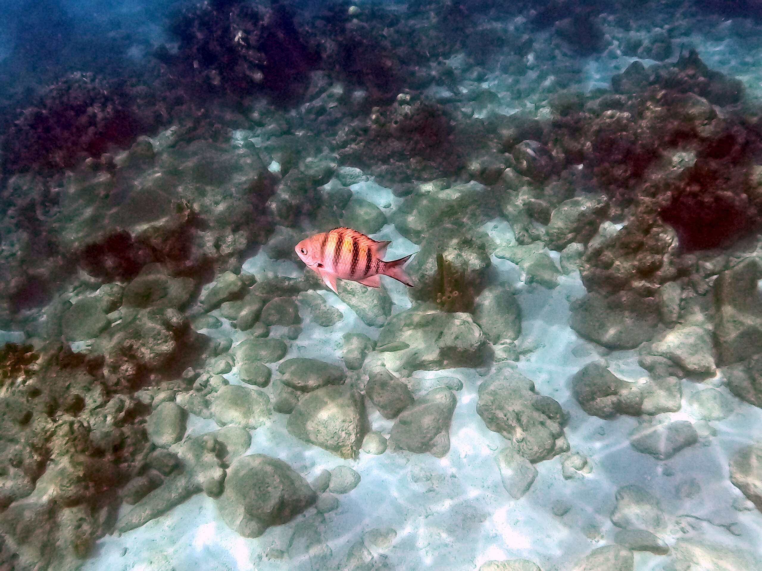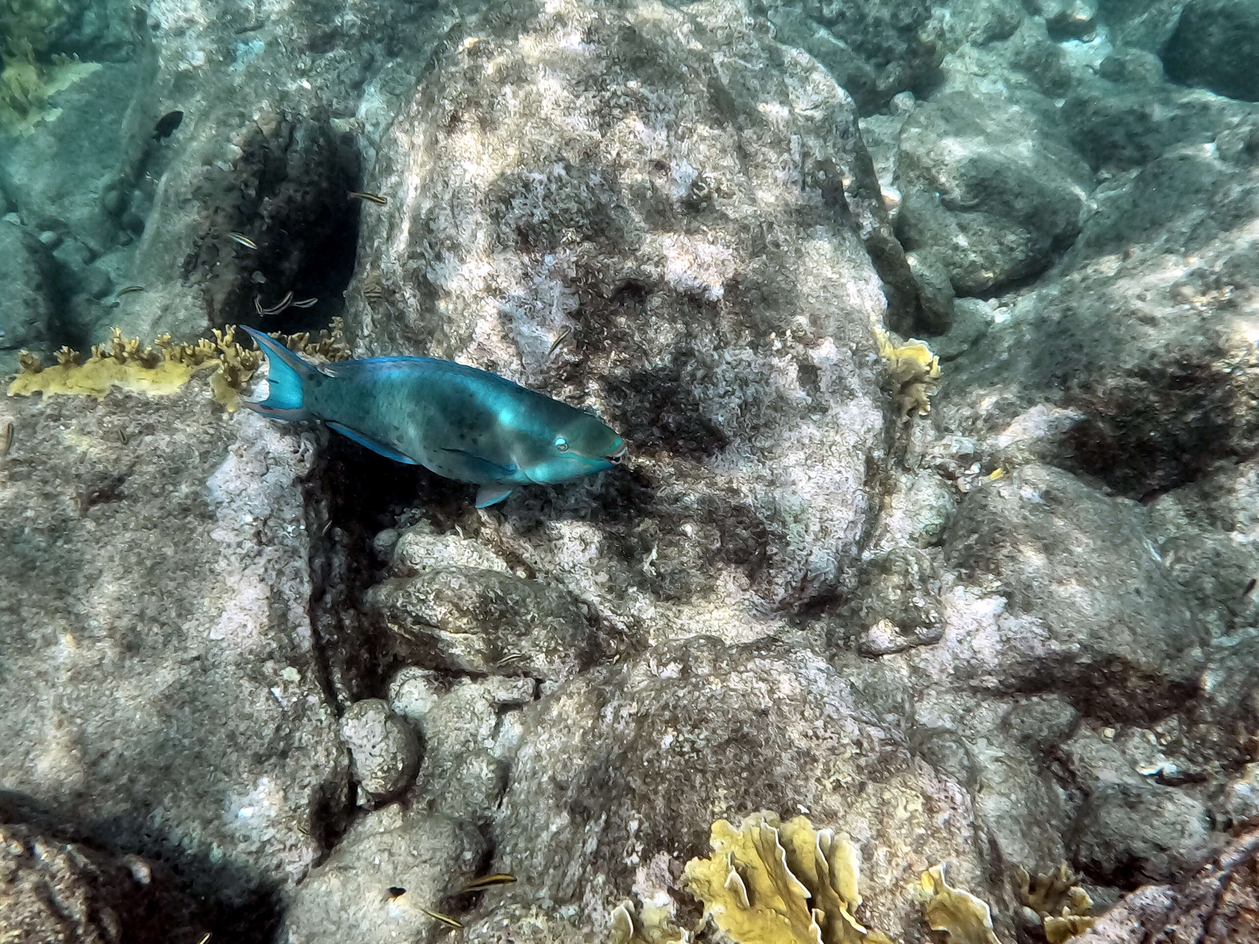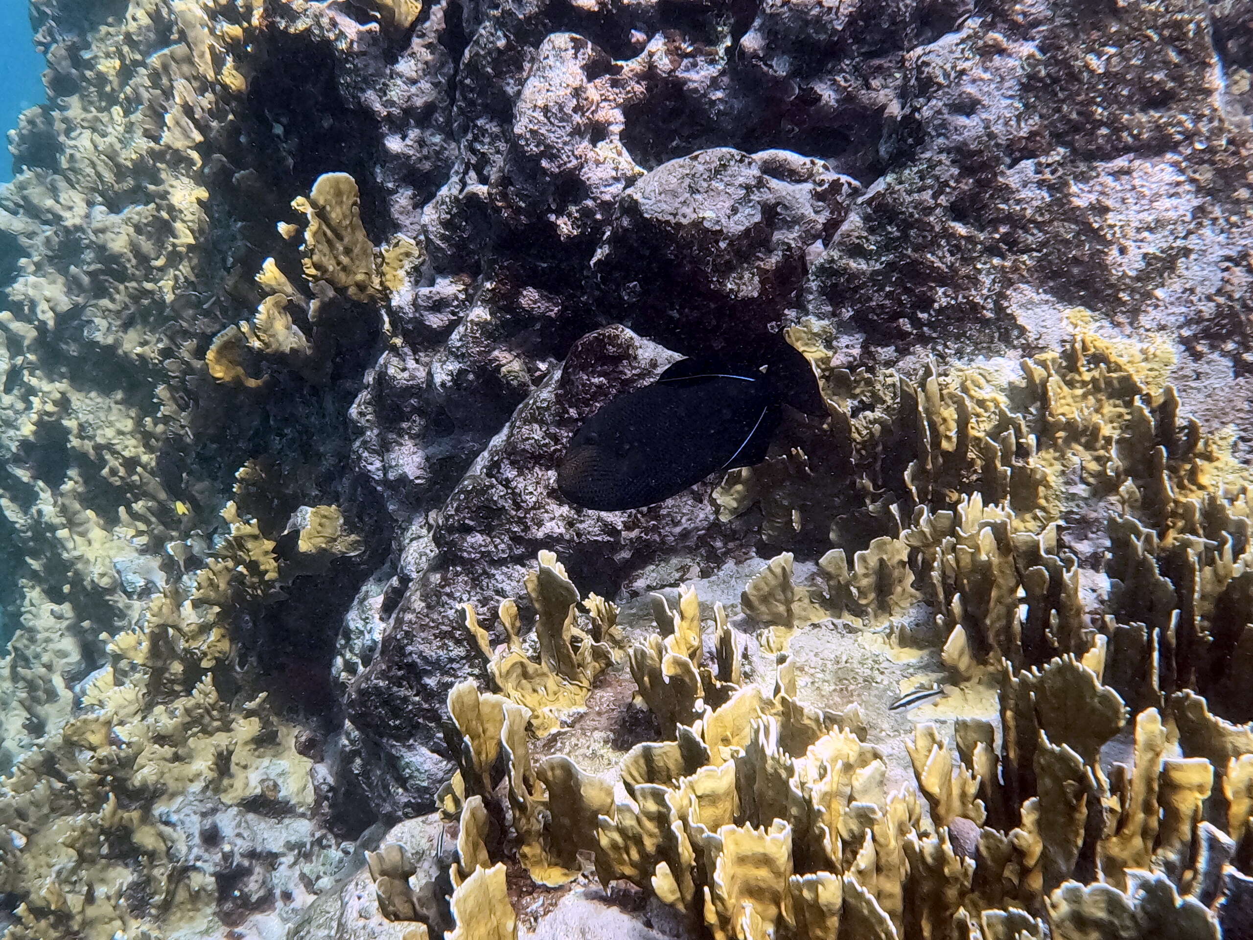 La zone de snorkeling que nous avons visitée se situe au niveau des îlets Pigeon, le spot appelé « la piscine » et celui appelé « le jardin de corail ». Ces deux spots sont très poissonneux et intéressants pour la diversité de la faune et flore que l’on y trouve. Il y a des bancs de poissons chirurgiens bleus et noirs ainsi que des bancs de balistes noirs. J’ai croisé un beau poisson lime qui se nomme bourse cabri, des demoiselles, cardinal queue fine, gorette jaune ou bleue, poisson lézard et bien d’autres espèces. Il y a également de beaux coraux comme les gorgones éventail ou les cornes d’élan, ainsi que de belles éponges comme les tuyaux d’orgues ou les barils de rhum. En résumé, la réserve de Cousteau est un très beau spot de snorkeling et pourtant nous n’avons pas eu le temps de visiter des spots tout aussi intéressants comme le jardin des tortues et le jardin japonais qui parait-il sont aussi beaux que ceux des îlets Pigeon. Les photos et vidéos ci-après montrent la richesse et la diversité des fonds marins visités.
