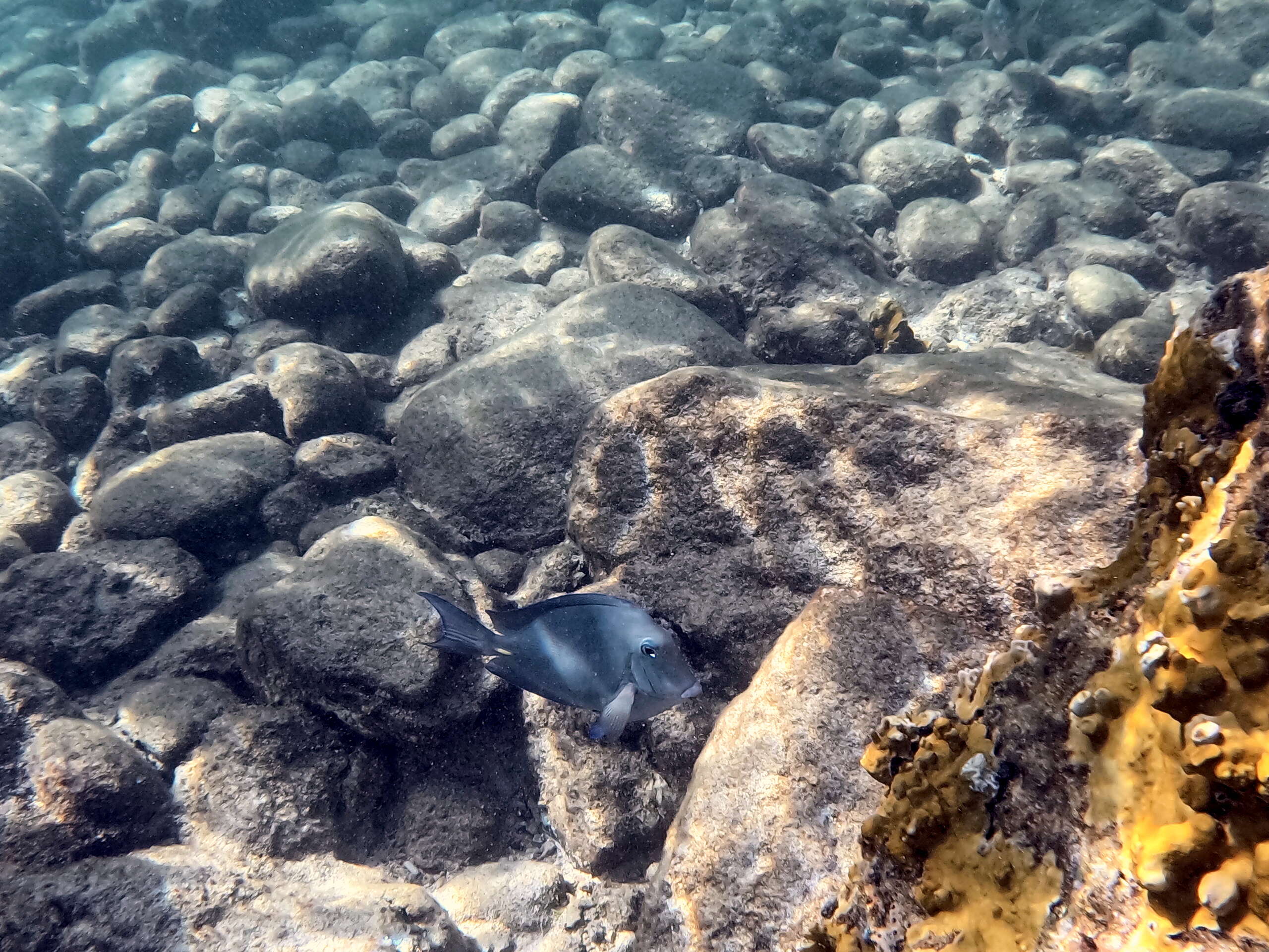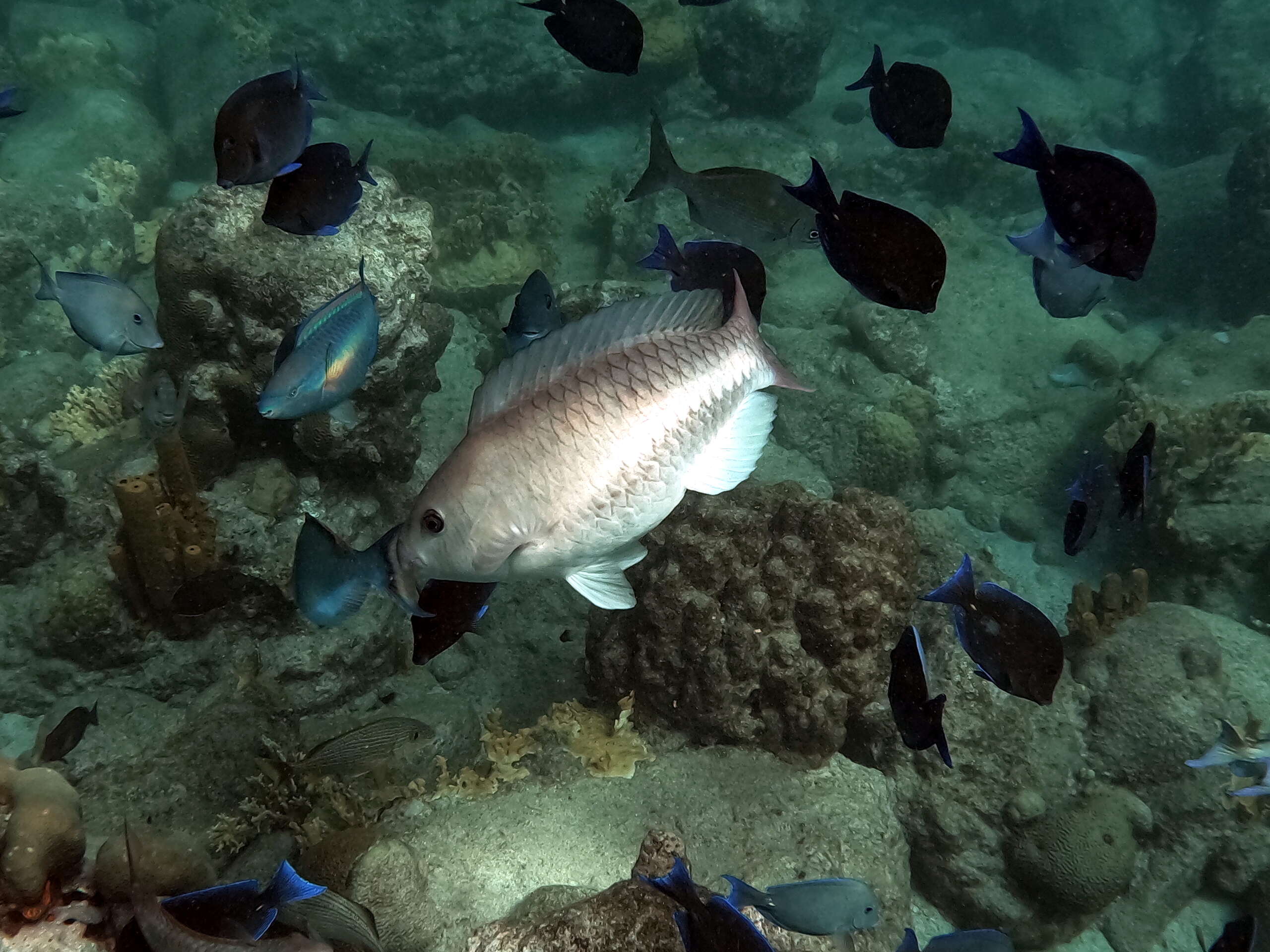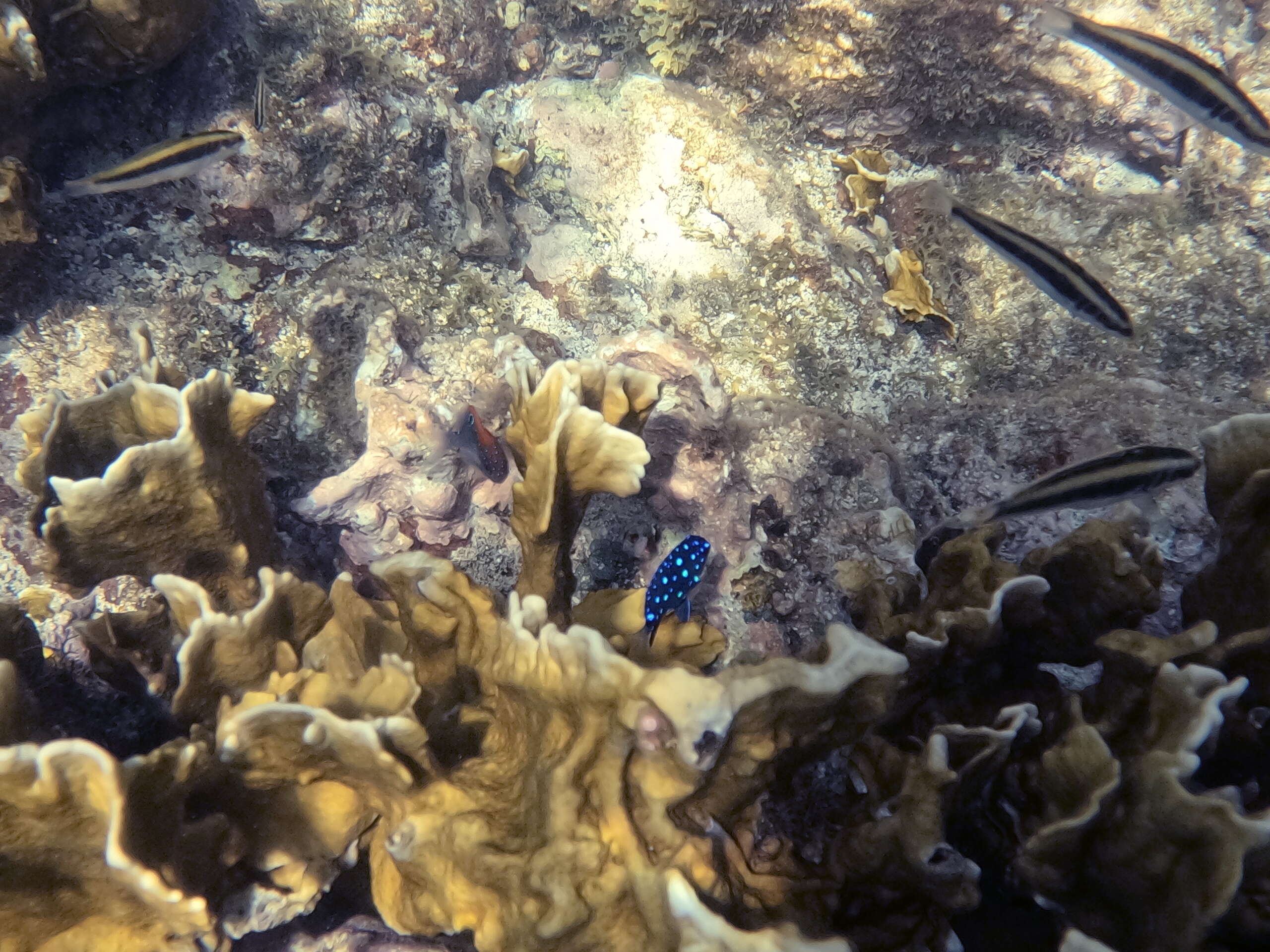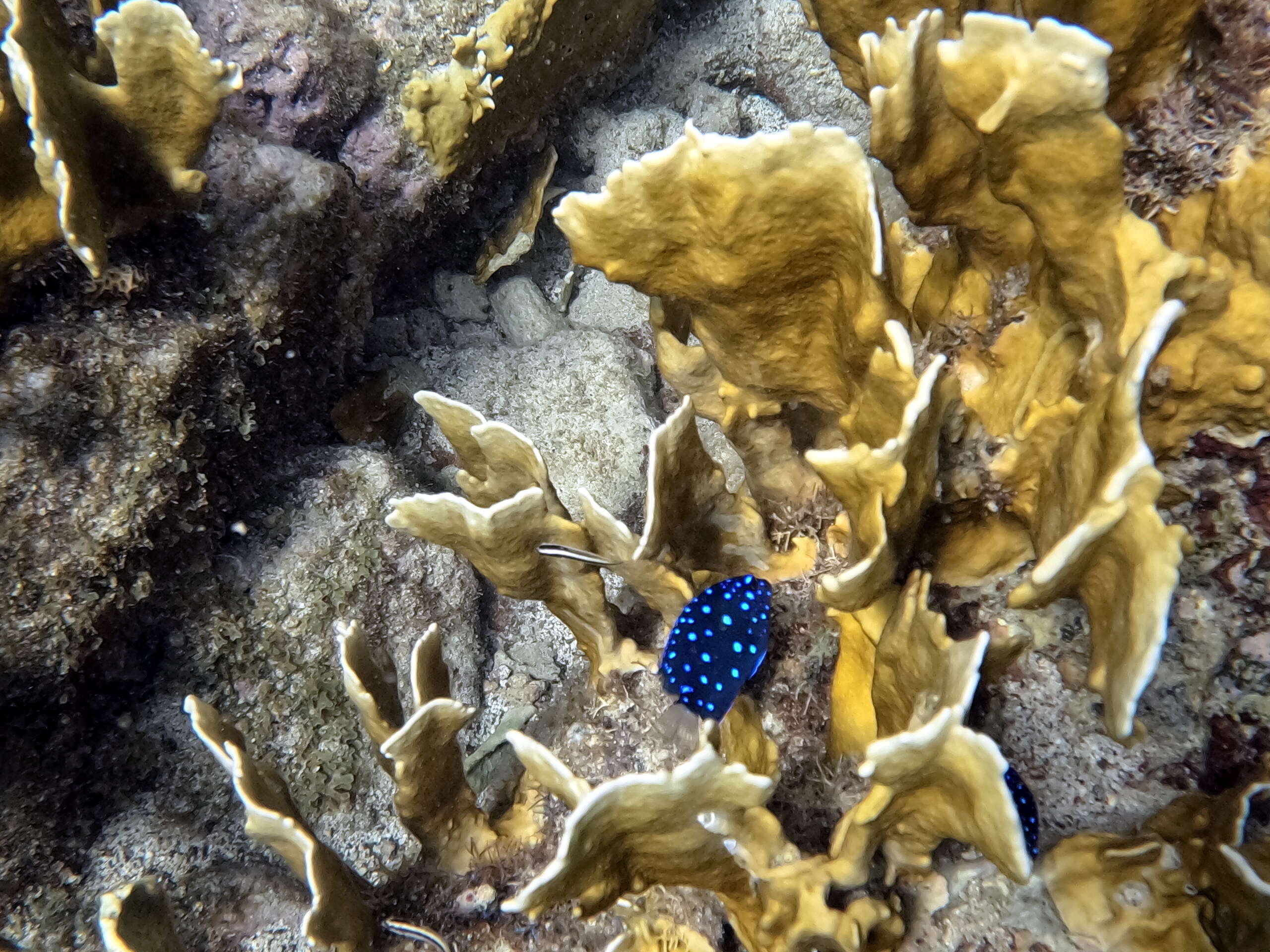 La zone de snorkeling que nous avons visitée se situe au niveau des îlets Pigeon, le spot appelé « la piscine » et celui appelé « le jardin de corail ». Ces deux spots sont très poissonneux et intéressants pour la diversité de la faune et flore que l’on y trouve. Il y a des bancs de poissons chirurgiens bleus et noirs ainsi que des bancs de balistes noirs. J’ai croisé un beau poisson lime qui se nomme bourse cabri, des demoiselles, cardinal queue fine, gorette jaune ou bleue, poisson lézard et bien d’autres espèces. Il y a également de beaux coraux comme les gorgones éventail ou les cornes d’élan, ainsi que de belles éponges comme les tuyaux d’orgues ou les barils de rhum. En résumé, la réserve de Cousteau est un très beau spot de snorkeling et pourtant nous n’avons pas eu le temps de visiter des spots tout aussi intéressants comme le jardin des tortues et le jardin japonais qui parait-il sont aussi beaux que ceux des îlets Pigeon. Les photos et vidéos ci-après montrent la richesse et la diversité des fonds marins visités.
