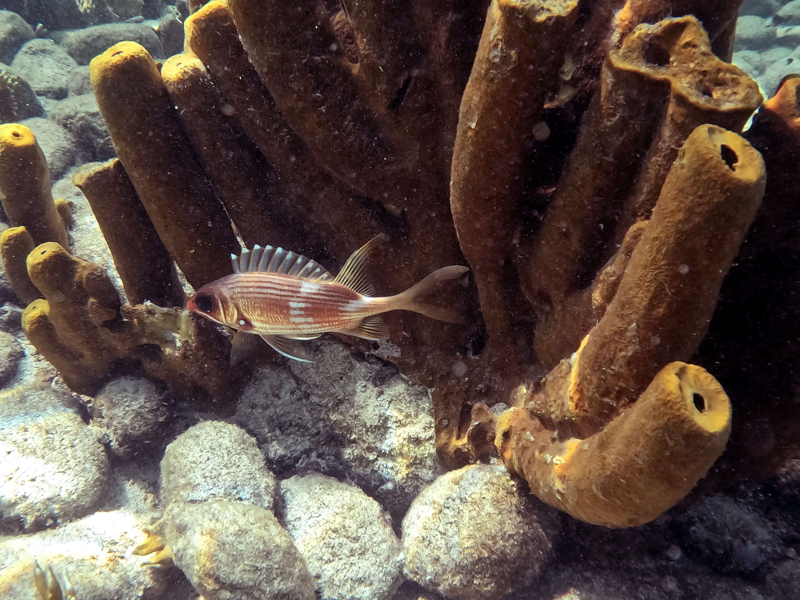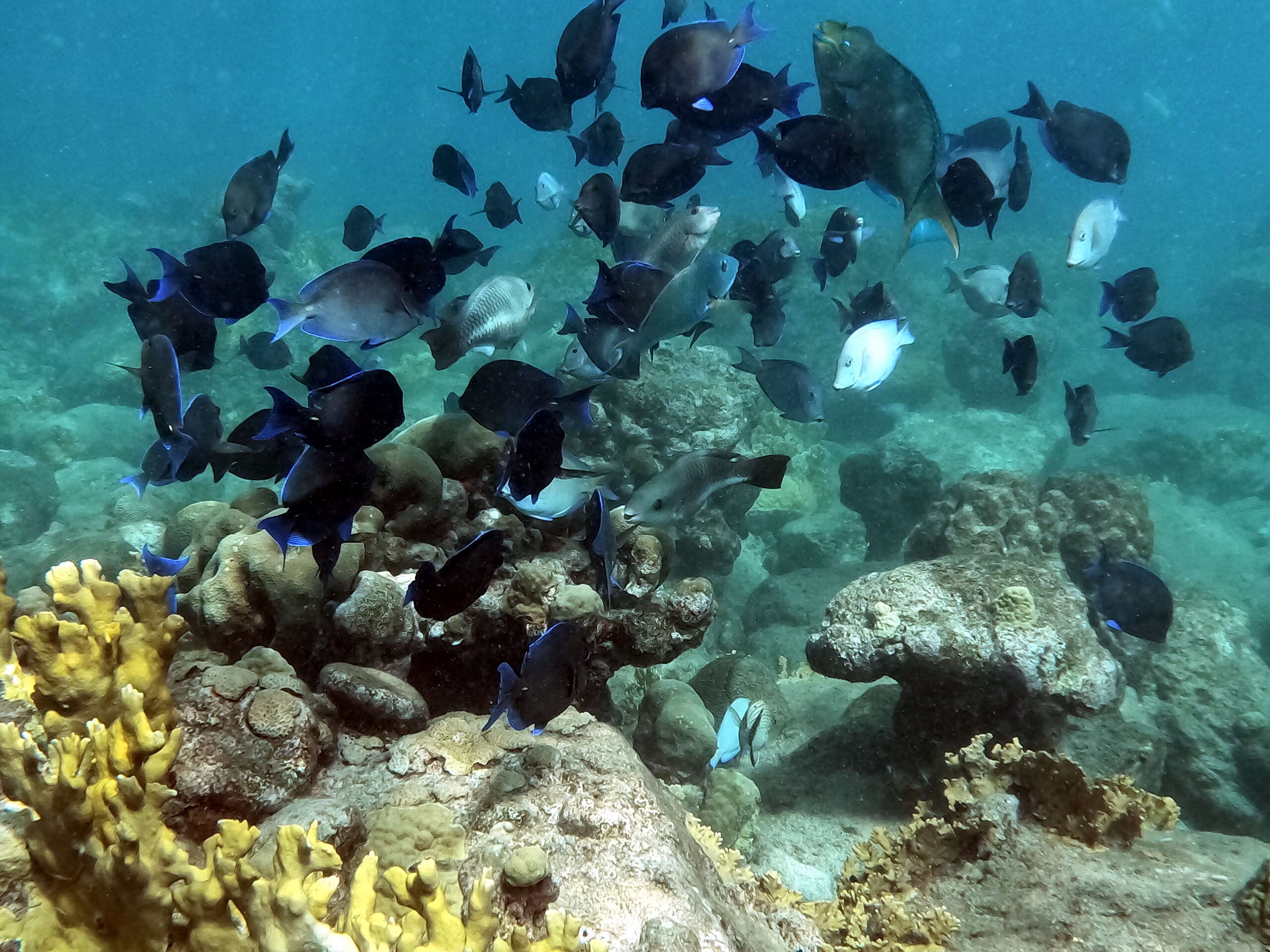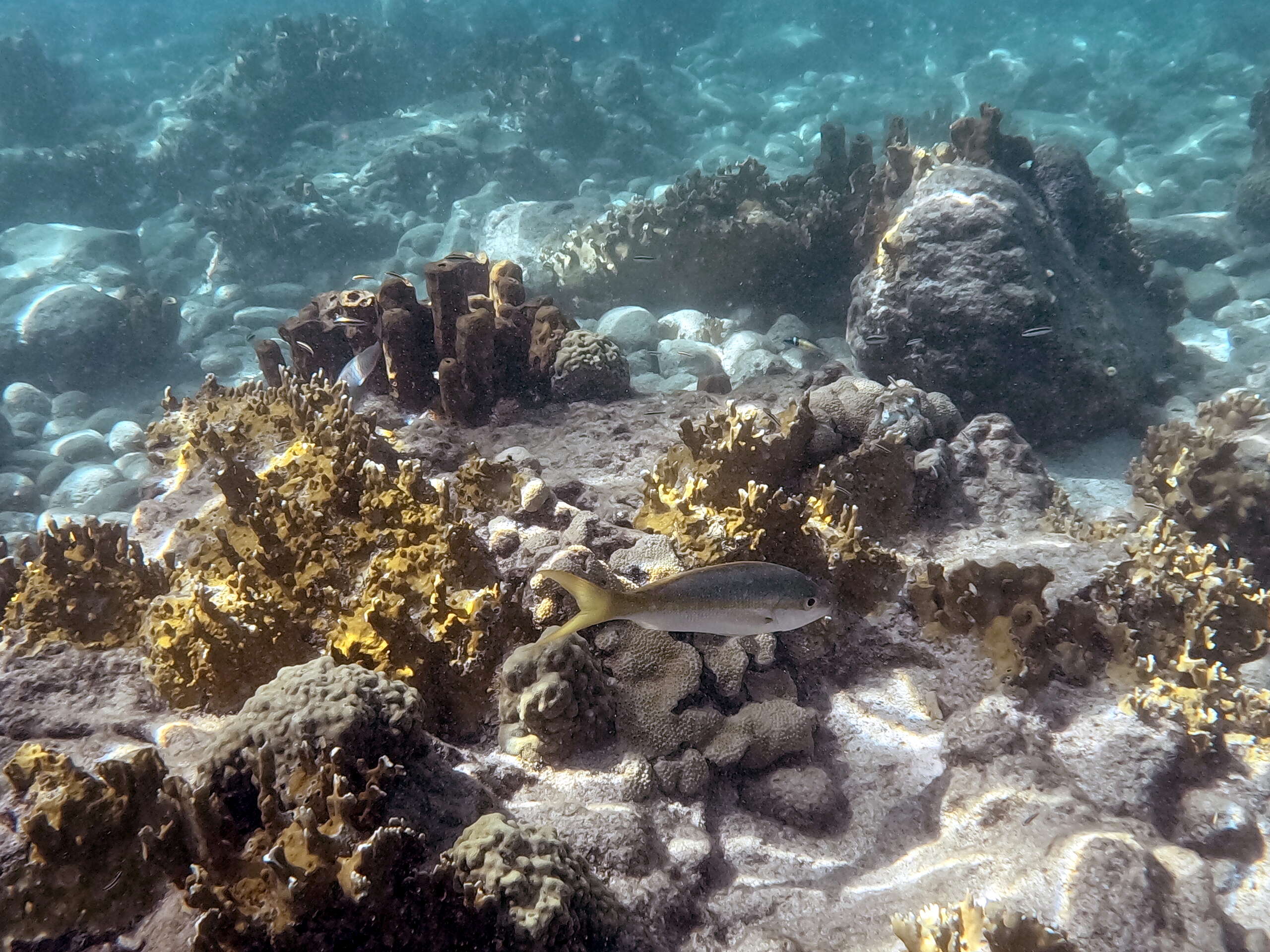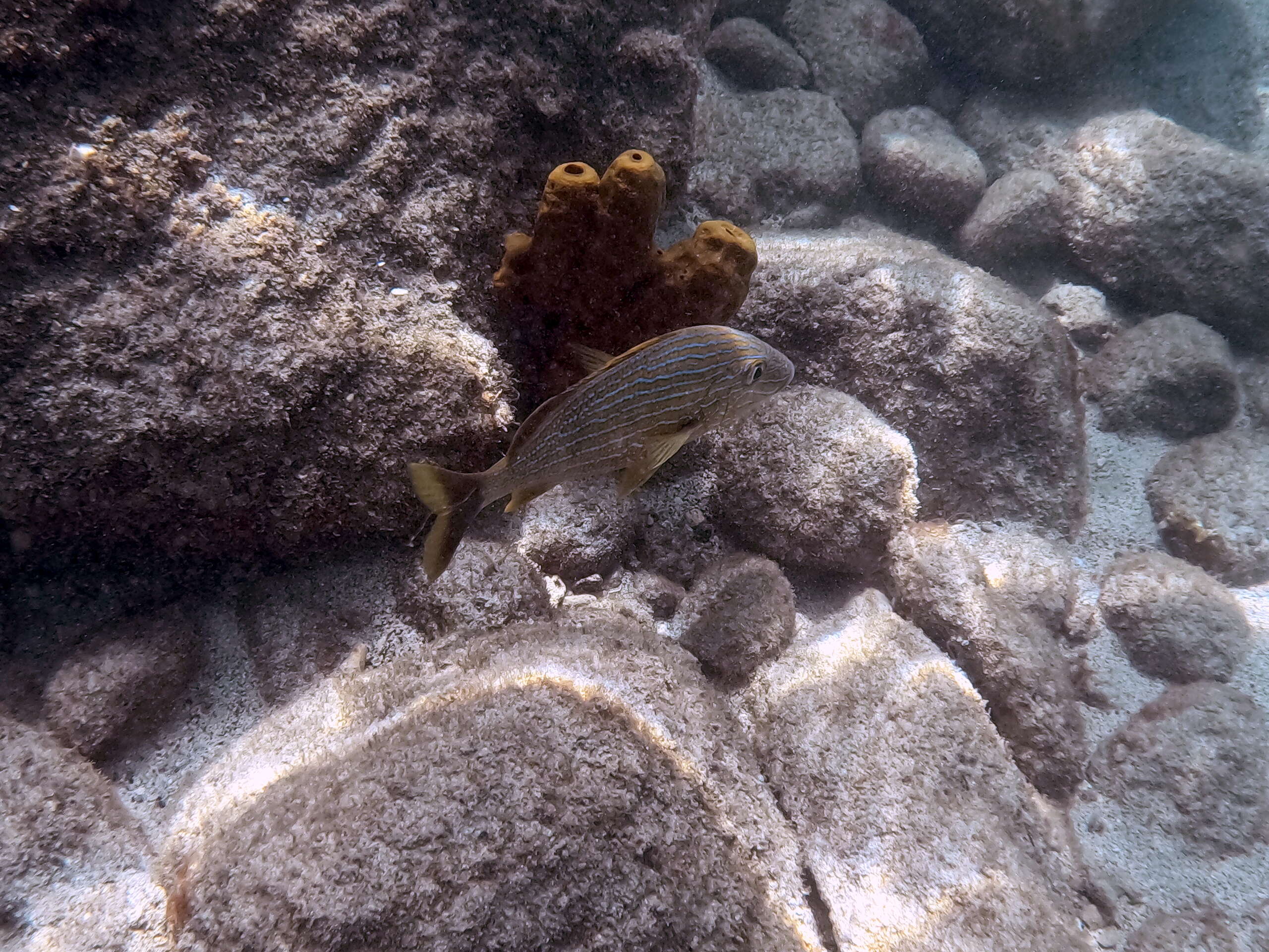 FAUNE & FLORE: poisson lézard rayé jaune, chirurgien noir, gorette jaune, cardinal queue fine, demoiselle à queue jaune, perroquet princesse, perroquet bleu, gorette bleue, orphie plate, bourse cabri, chirurgien bleu, coffre mouton, coffre zinga, baliste noir, barbarin blanc, vivaneau à queue jaune, sergent major, corail gorgone, corail corne d’élan, éponge tuyau d’orgue.